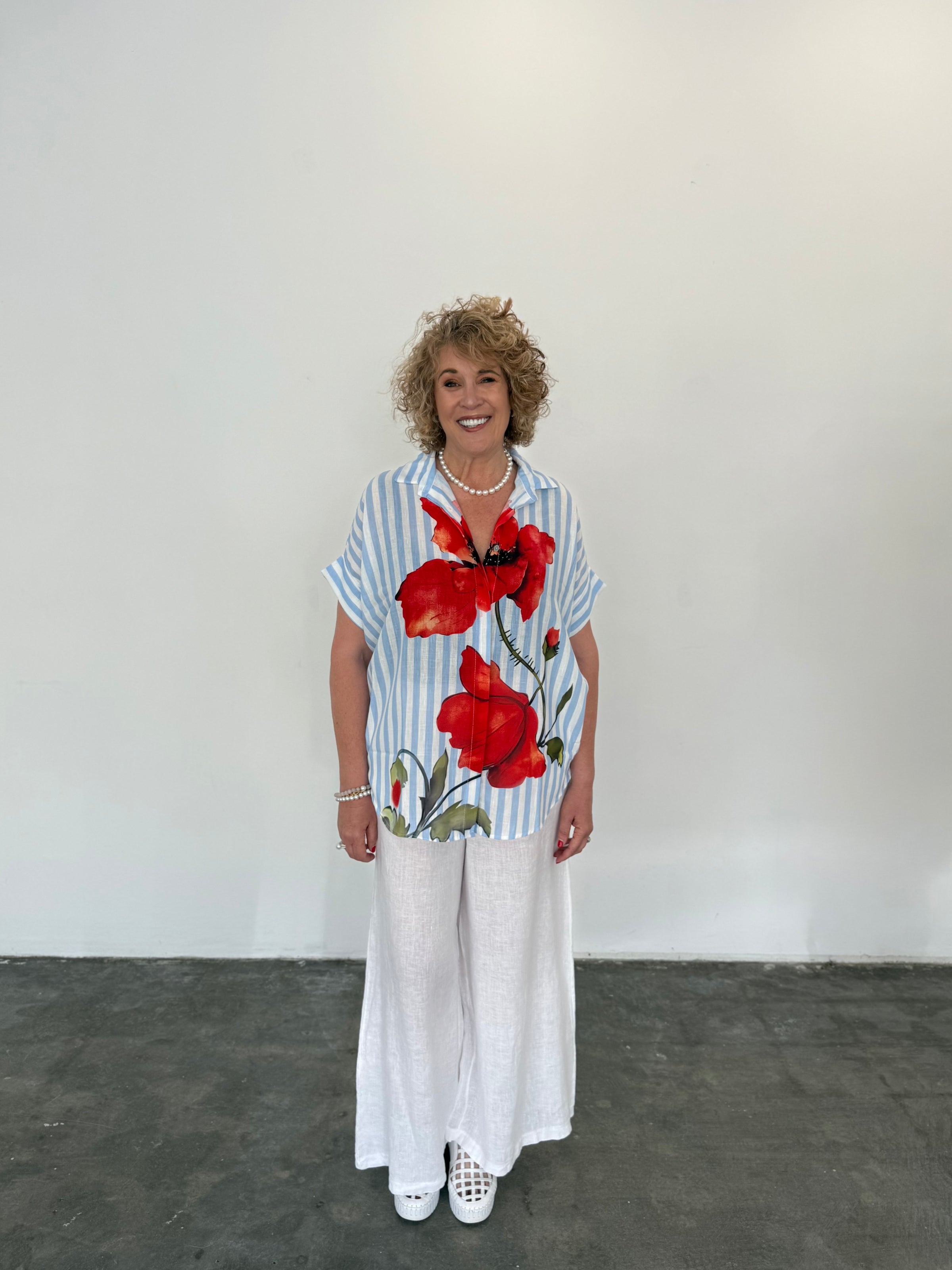 Linen Blend Hi-Lo Shirt - Bloom Stripe