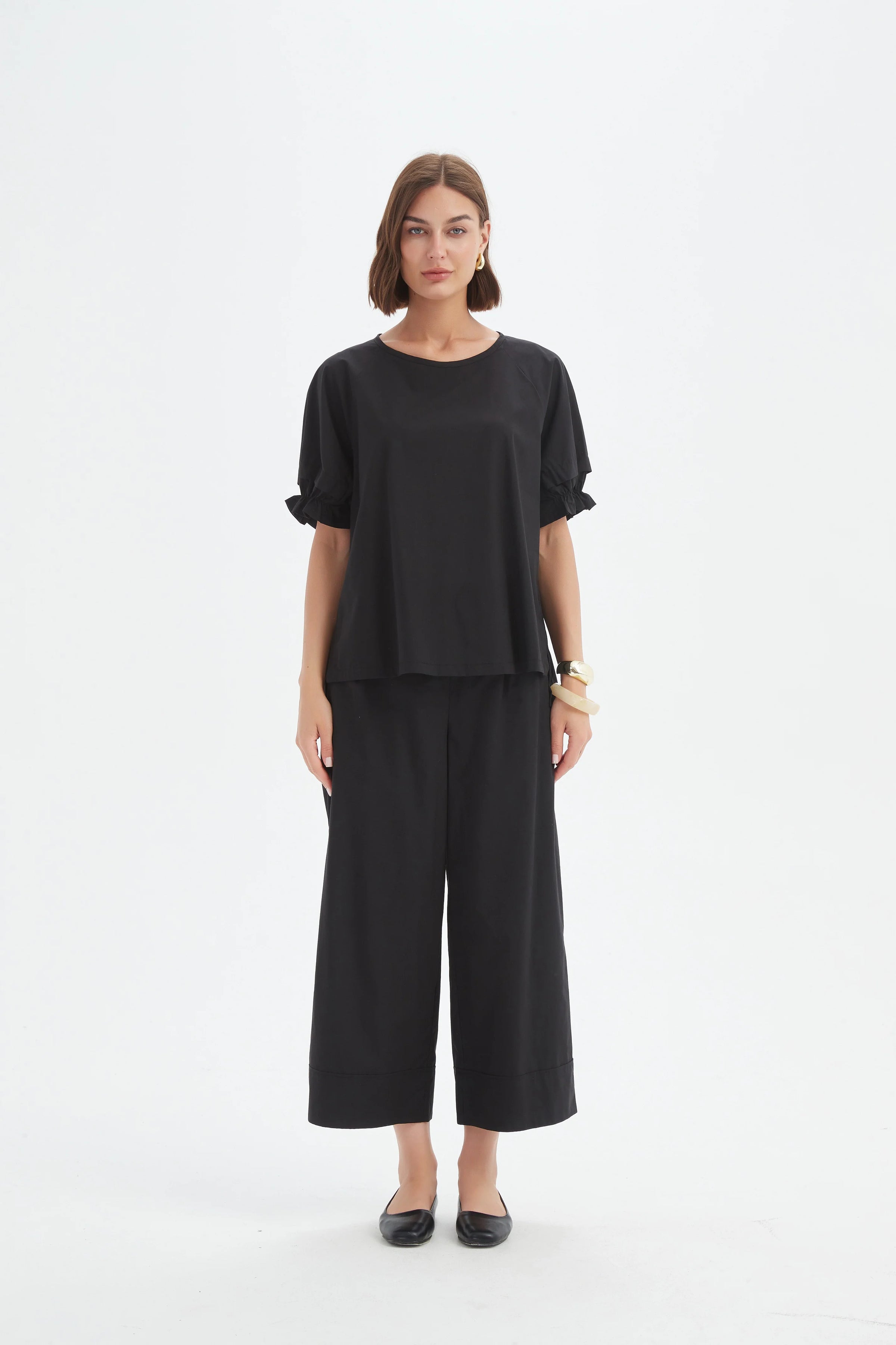Ruffle Sleeve Lyocell Top - Black